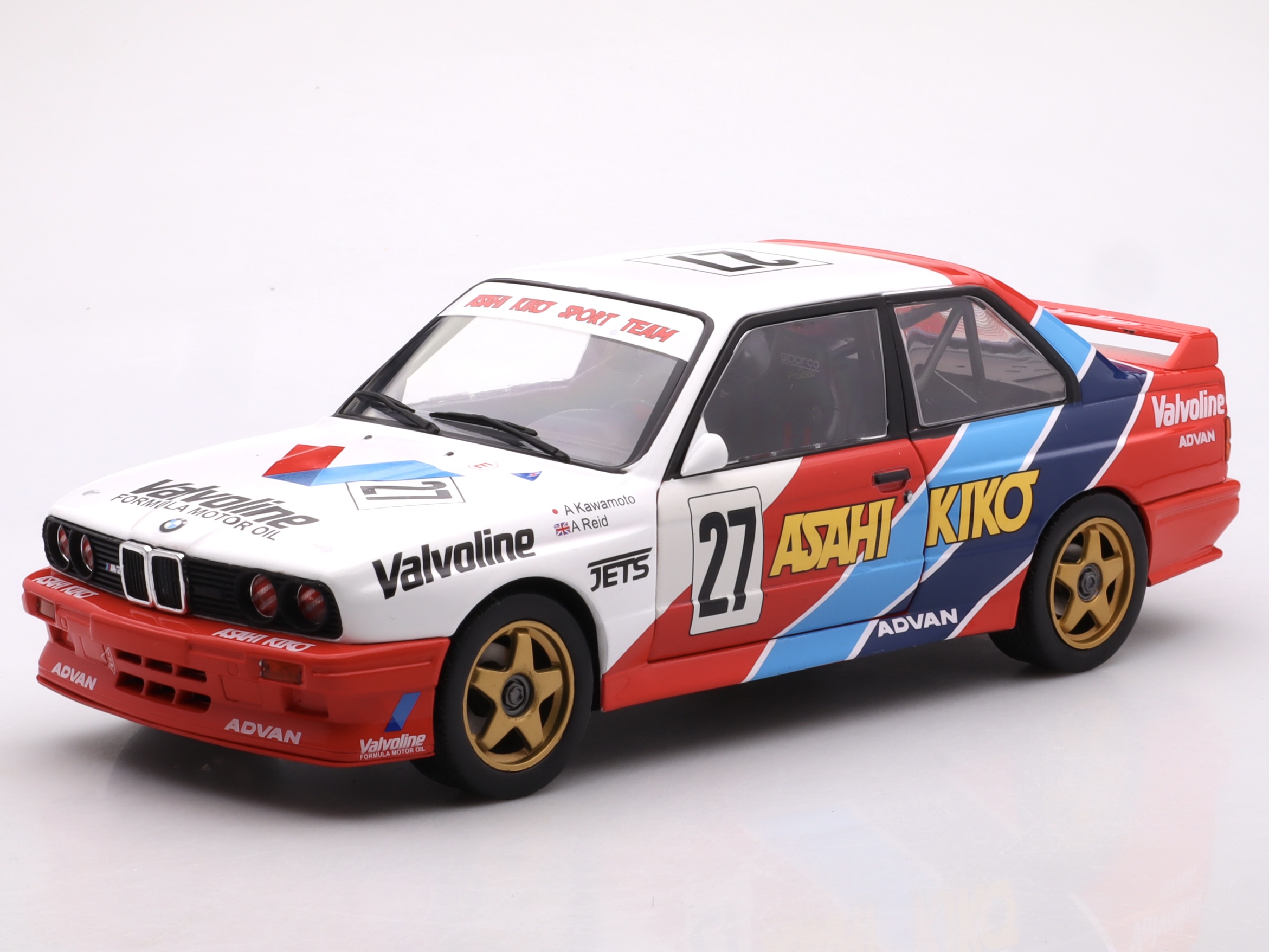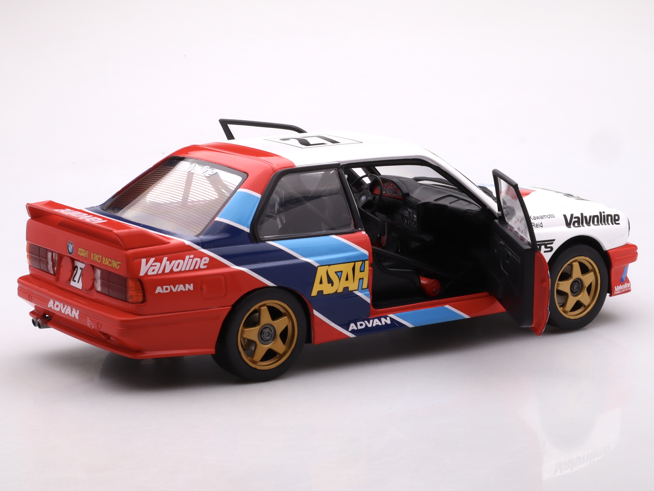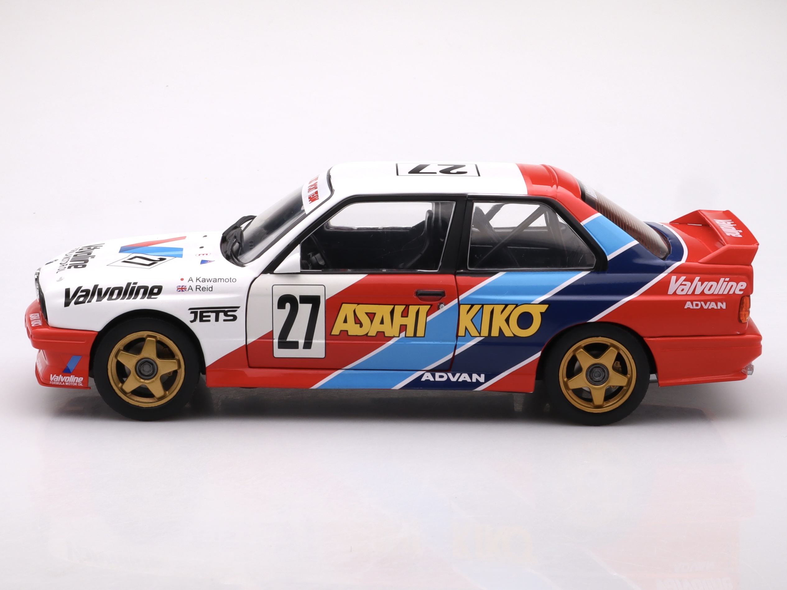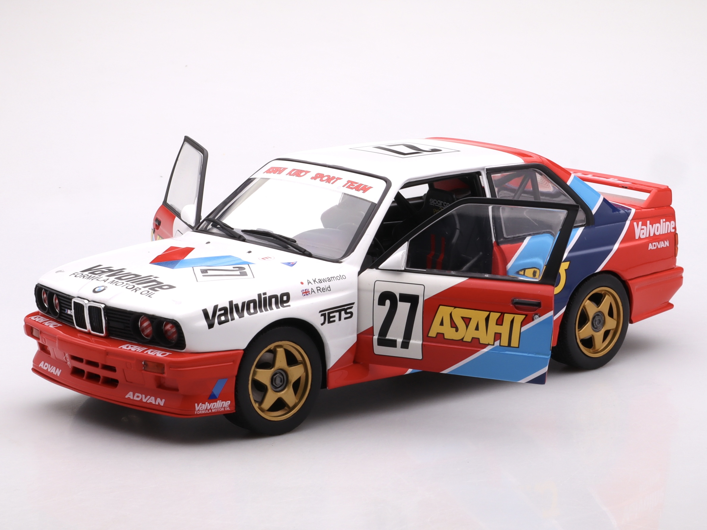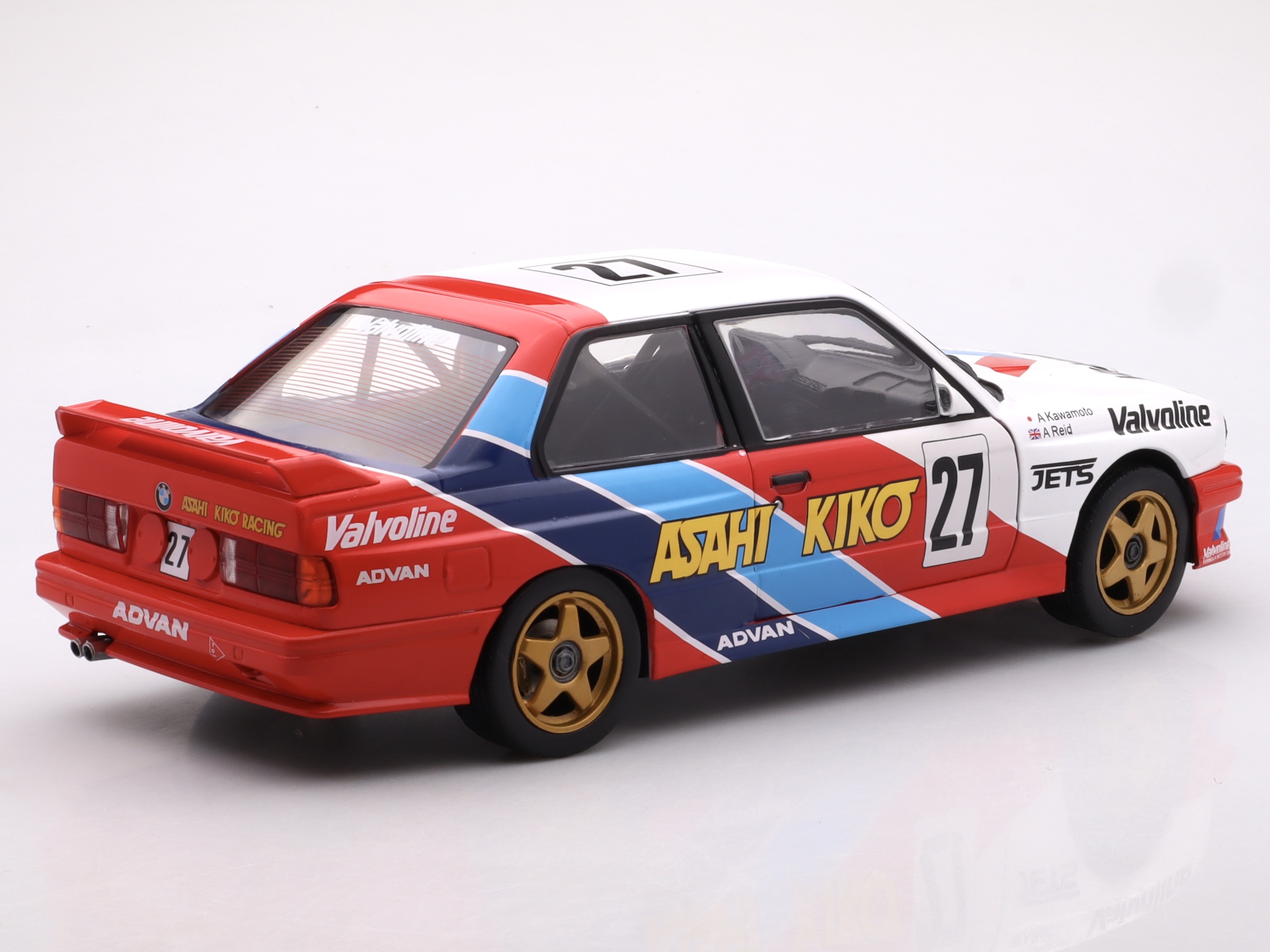 Charakterystyczna sylwetka E30, agresywny spoiler tylny i detale wyścigowe zostały wiernie odwzorowane, a numer startowy #27 i malowanie typowe dla serii JTCC podkreślają autentyczność modelu. Duża skala pozwala docenić precyzyjne detale nadwozia i sportowy charakter auta, czyniąc go idealnym dodatkiem do każdej kolekcji wyścigowych klasyków.