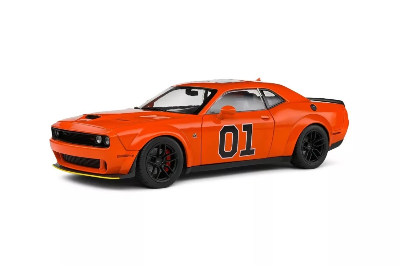 1:18, Coupe, Ausweichen, Metall, Muscle-Car, Solido, JAAmerikanisches Autofahren in seiner reinsten, kraftvollsten Form – das ist der Dodge Challenger R/T Scat Pack Widebody (Modelljahr 2023) in markantem Orange. Dieses Modell im Maßstab 1:18 von Solido ist eine wahre Hommage an den klassischen Muscle-Car-Geist, gekleidet in eine moderne, aggressive Silhouette.