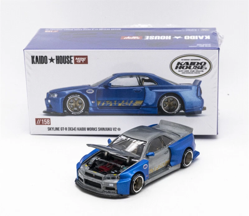 Model (CHASE) Nissan Skyline GT-R (R34) Kaido Works Shinjuku V2 – 1999, blue wykonany w skali 1:64 przez producenta Kaido House x Mini GT