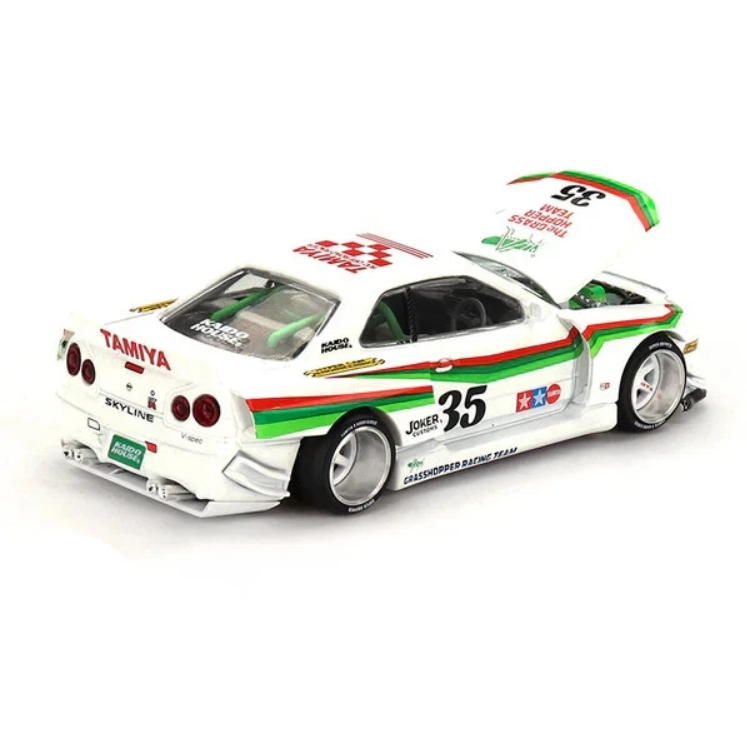 Nissan Skyline GT-R (R34) X Tamiya "The Grasshopper" V1 - 1999 model made in 1:64 scale by Mini GT manufacturer
