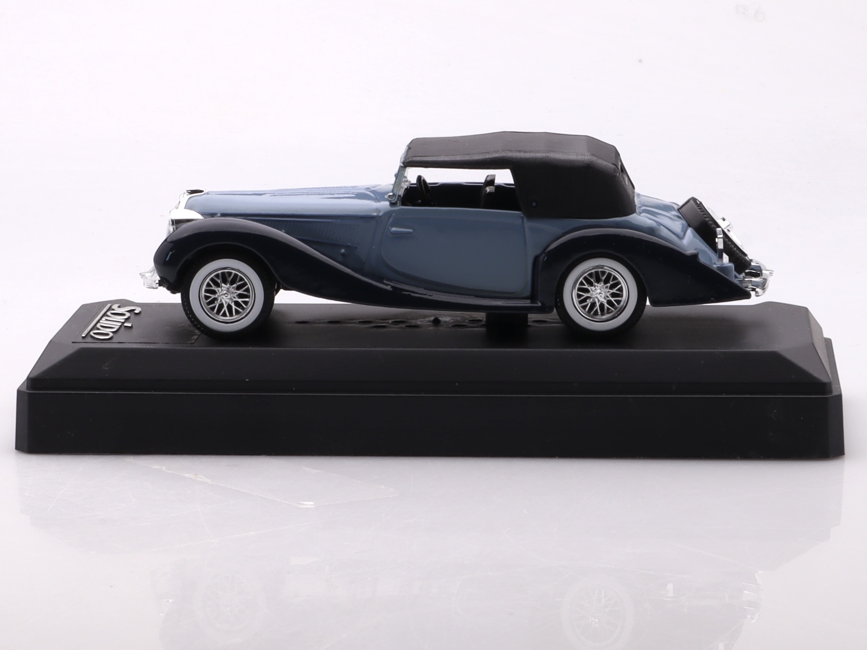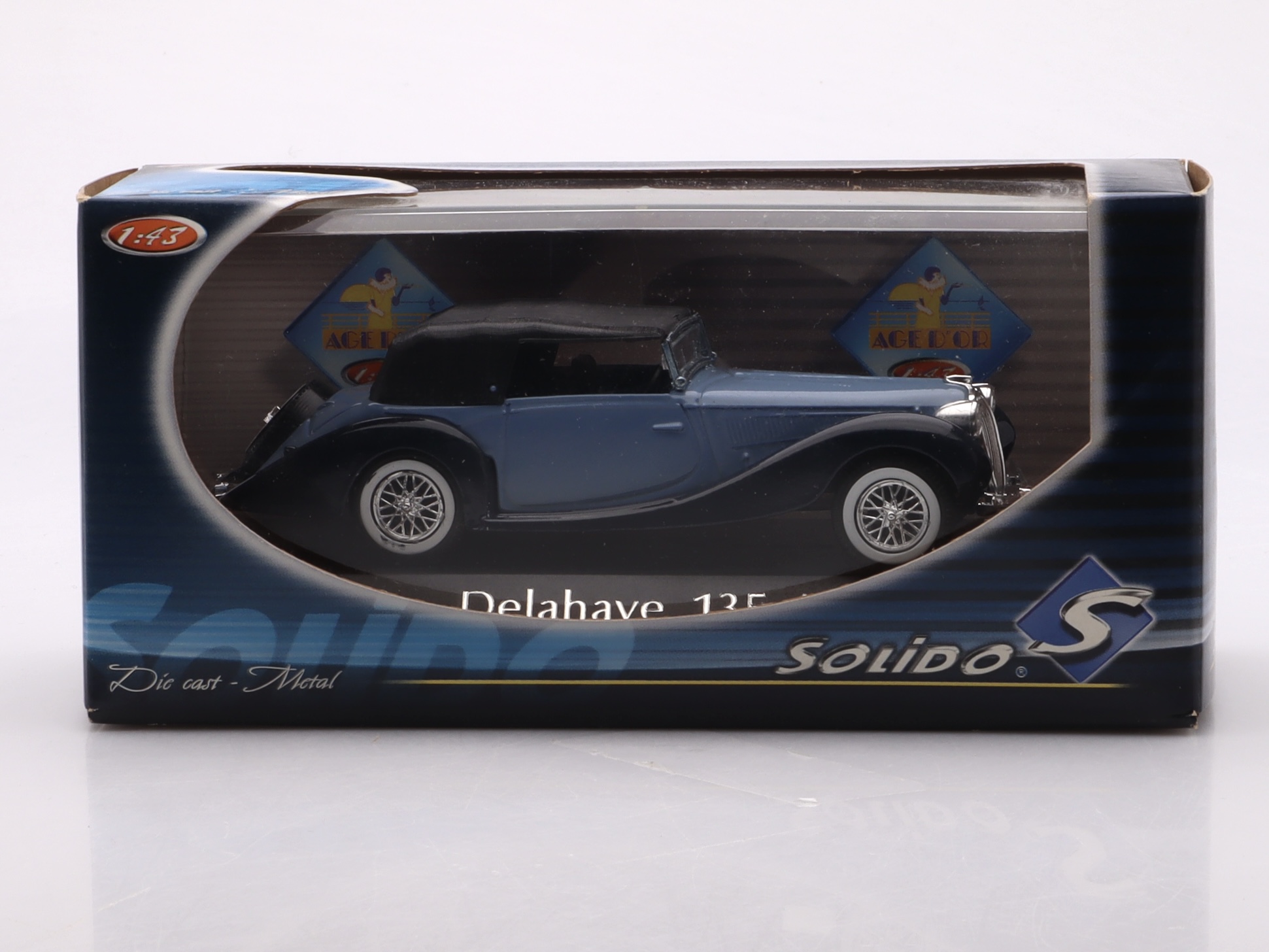 Delahaye Type 135 M był jednym z flagowych pojazdów tej legendarnej marki, zaprezentowanym w 1935 roku. Model Type 135 M Convertible był wersją kabrioletową, której elegancka sylwetka, smukłe linie nadwozia i art-deco’owy design do dziś budzą podziw wśród miłośników motoryzacji. Model Solido wiernie oddaje te cechy, pokazując precyzyjne detale, takie jak charakterystyczne reflektory, chromowane akcenty na grillu i kołach, a także bogato zdobione wnętrze.
