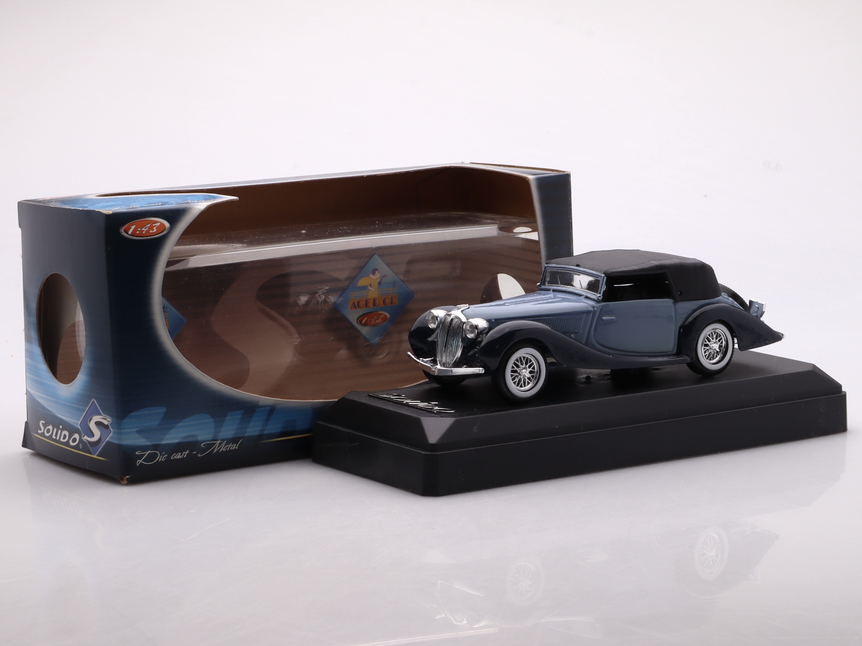 Model Delahaye Type 135 M Convertible w skali 1:43, stworzony przez renomowaną firmę Solido, to doskonałe odwzorowanie jednego z najpiękniejszych francuskich samochodów klasycznych. Model w przepięknym, głębokim odcieniu niebieskiego przyciąga wzrok i oddaje elegancję oraz luksus, które były synonimem marki Delahaye w latach 30. XX wieku.