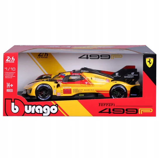 Samochód przedstawiono w charakterystycznych barwach zespołu AF Corse, z oznaczeniem numeru startowego #83, którym w Le Mans w 2024 roku jechał m.in. Robert Kubica. Aerodynamiczne kształty prototypu 499P zostały dokładnie oddane – nisko osadzony przód, rozbudowane skrzydła, duży tylny spojler i widoczne elementy wyścigowej konstrukcji podkreślają charakter auta LMDh/Hypercar. Malowanie z logotypami sponsorów oraz realistyczne detale, takie jak felgi, opony slick czy kabina kierowcy, dodają modelowi autentyczności.