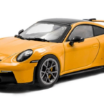Kolekcjonerski model Porsche 911 (992) GT3 z 2023 roku w intensywnym żółtym kolorze, wykonany przez renomowaną markę Solido w skali 1:43. Miniatura wiernie oddaje agresywną sylwetkę torowej wersji GT3 – z charakterystycznym tylnym skrzydłem, sportowym pakietem aerodynamicznym i dopracowanymi detalami nadwozia.