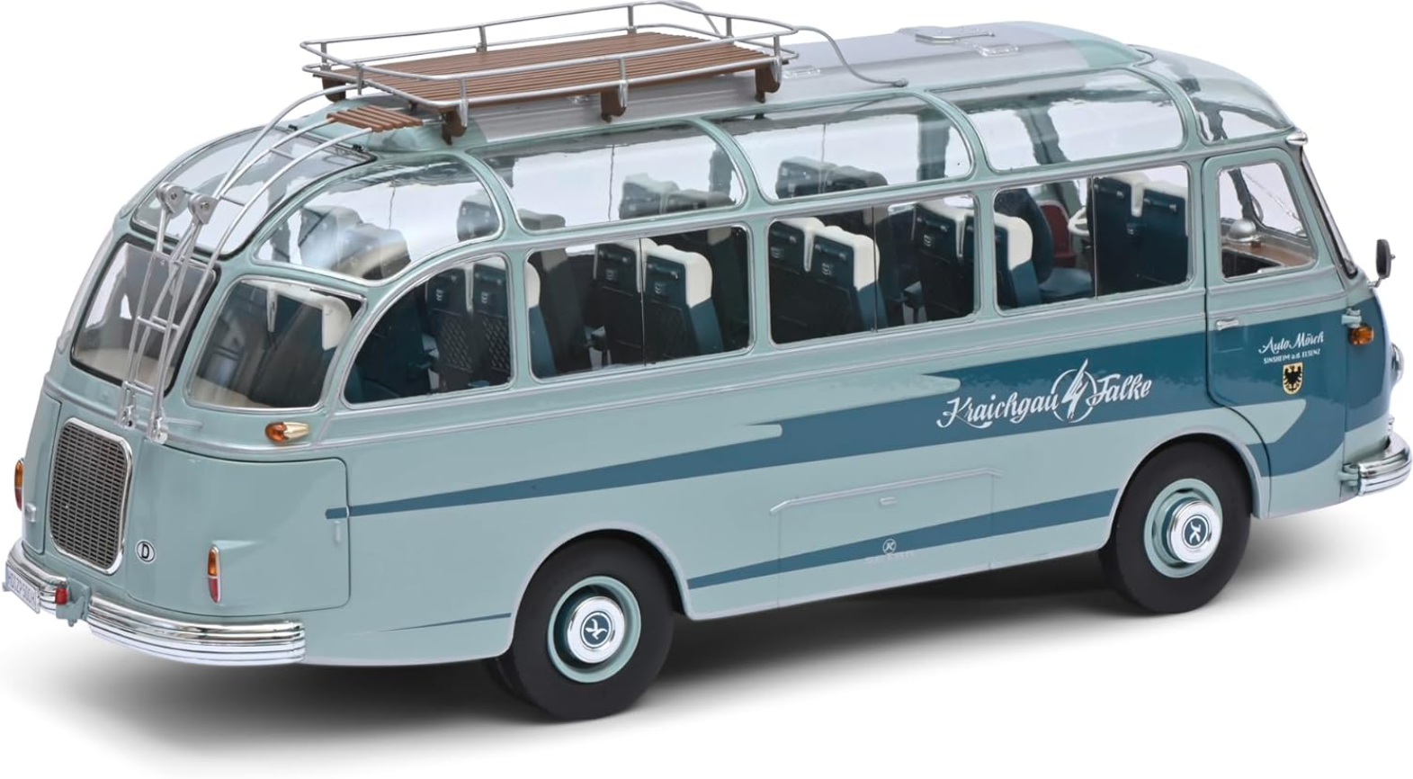 Model zachwyca bardzo wysokim poziomem odwzorowania detali – od charakterystycznej, opływowej sylwetki Setry S6, przez realistyczne elementy karoserii, aż po starannie wykonane wnętrze z rzędami siedzeń. Oryginalne malowanie „Kraichgaufalke” nadaje miniaturze wyjątkowego, historycznego charakteru i czyni ją prawdziwą perełką kolekcjonerską.