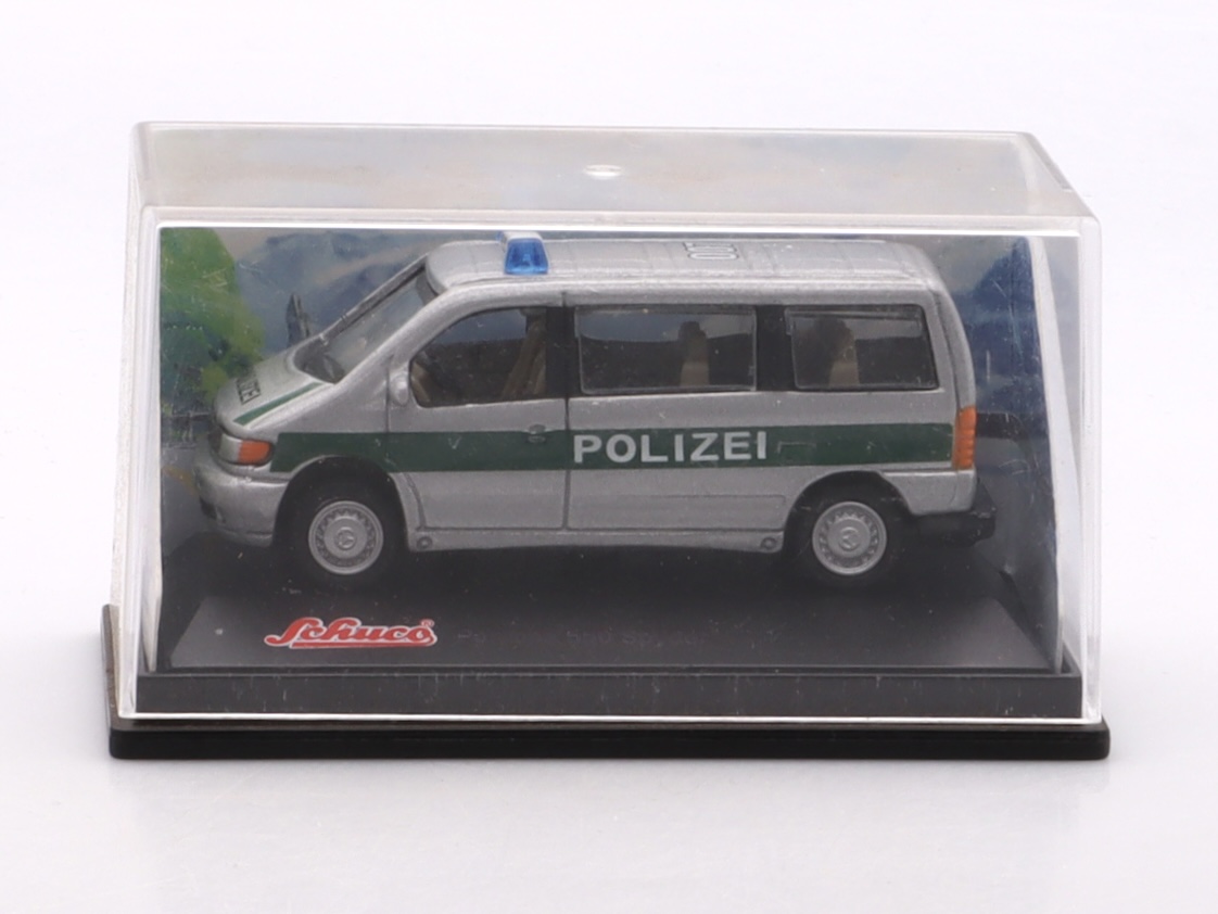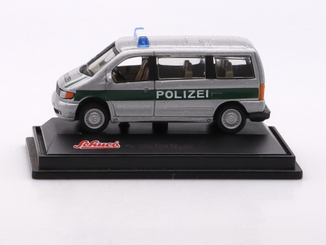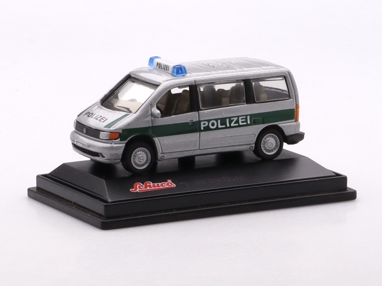 Model Volkswagen T5 Polizei firmy Schuco w skali 1:87 (H0) to starannie wykonana miniatura policyjnego pojazdu patrolowego. Charakterystyczne malowanie niemieckiej policji, realistyczne oznaczenia oraz proporcjonalna sylwetka wiernie oddają wygląd prawdziwego Volkswagena T5 wykorzystywanego w służbach mundurowych.